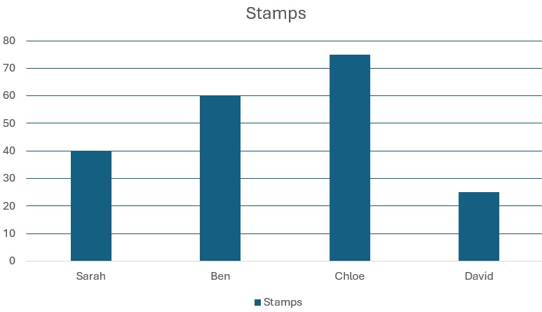 The bar graph below shows the number of stamps collected by four friends for a school project.