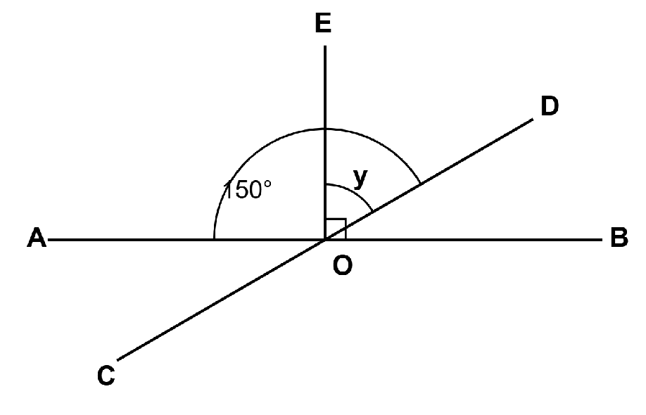 26. In the figure below, AB and CD are straight lines that intersect at point O. Ray OE is perpendicular to line AB. If ∠AOD = 150°,